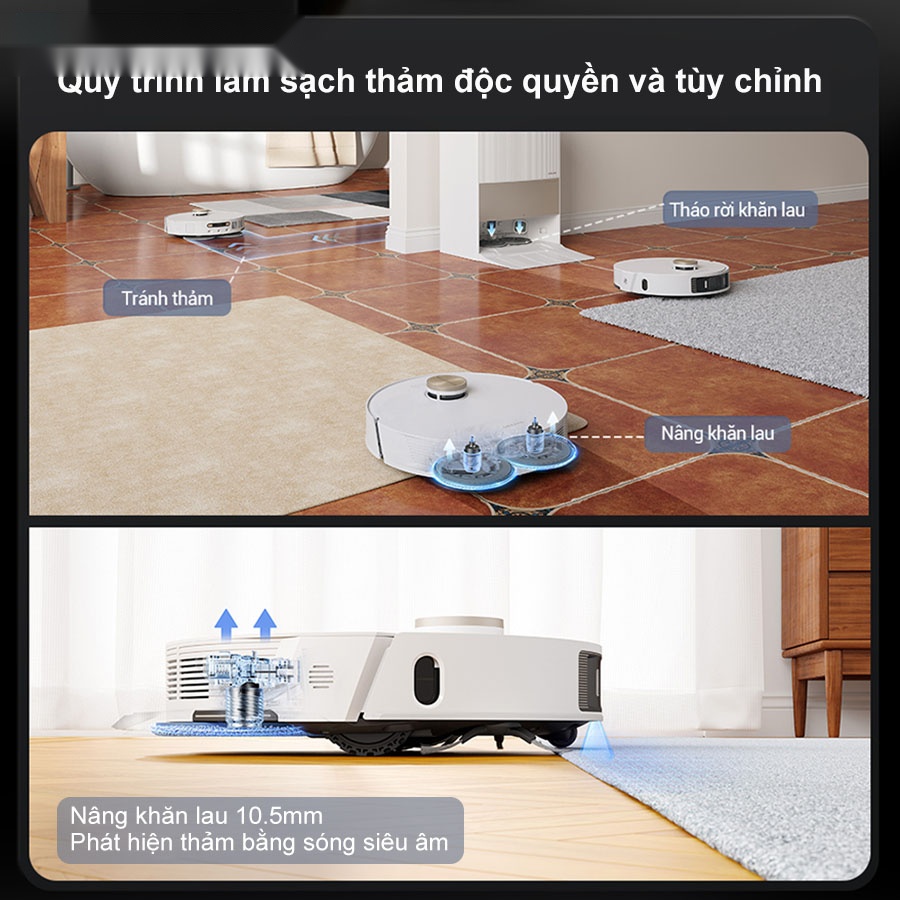 - Tự động nâng giẻ khi gặp thảm: Tính năng giúp robot dễ dàng hút bụi trên thảm mà không làm ướt thảm.
