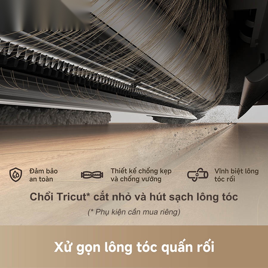 Không còn cảnh phải gỡ tóc khỏi chổi sau mỗi lần dọn dẹp, robot hút bụi lau nhà Dreame L50 Ultra CE có thể lắp đặt chổi TriCut™ chống rối thông minh, có khả năng cắt nhỏ và hút sạch tóc, lông thú ngay trong quá trình làm việc. Thiết kế chống kẹp và chống vướng giúp robot vận hành trơn tru, đảm bảo 0% tình trạng rối tóc, mang lại sự tiện lợi và an toàn tuyệt đối cho người dùng. (*Phụ kiện chổi Tricut cần mua riêng, không có sẵn trong hộp)