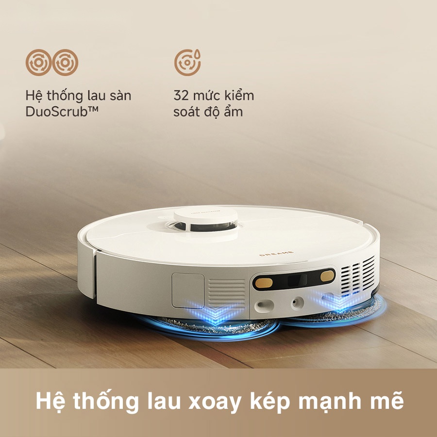 Dreame L50 Ultra CE được trang bị bộ đôi giẻ lau xoay tốc độ cao DuoScrub™ kết hợp cùng lực ép mạnh giúp đánh bay vết bẩn cứng đầu, kể cả những vết bám lâu ngày. Hệ thống này còn được hỗ trợ bởi 32 mức điều chỉnh độ ẩm chính xác, giúp kiểm soát lượng nước vừa đủ cho từng loại sàn từ gỗ, gạch đến đá hoa. Nhờ đó, sàn luôn sạch sâu nhưng khô nhanh và an toàn với thú cưng, không lo trơn trượt hay ẩm mốc.