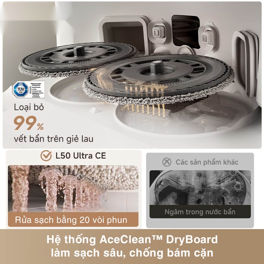 Khác biệt hoàn toàn so với các trạm giặt truyền thống, hệ thống AceClean™ DryBoard của Dreame L50 Ultra CE được thiết kế với bề mặt phẳng chống bám cặn, cho phép quá trình rửa giẻ và xả nước bẩn diễn ra khép kín. Nhờ vậy, dock luôn sạch bóng, không đọng nước, không mùi, giảm đáng kể công việc vệ sinh thủ công của người dùng. Đây chính là bí quyết giúp robot luôn vận hành ổn định, bền bỉ và giữ hiệu quả làm sạch tối ưu qua thời gian.