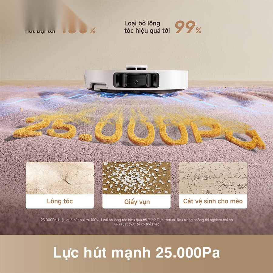 Được trang bị động cơ TurboForce thế hệ thứ 6, robot hút bụi lau nhà Dreame L50 Ultra CE tạo ra lực hút Vormax™ lên tới 25.000Pa, mạnh mẽ hơn đáng kể so với các dòng robot thông thường. Với khả năng hút sạch tới 99% bụi bẩn và 100% lông tóc, thiết bị xử lý gọn gàng mọi loại rác, từ bụi mịn, cát thú cưng đến mảnh vụn trên thảm và sàn cứng, tất cả chỉ trong một lần hút duy nhất. Kết quả là bề mặt sàn luôn sạch sâu, không còn dấu vết bụi hay tóc rối bám lại.