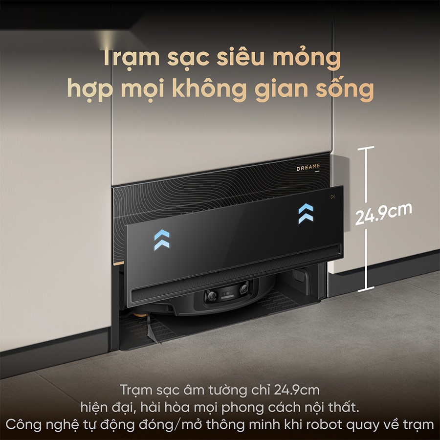Robot hút bụi lau nhà Dreame X60 Master sở hữu triết lý thiết kế tinh gọn với bộ đôi siêu mỏng gồm thân máy chỉ 7,95cm và trạm sạc cao 24,9cm. Nhờ kích thước tối ưu, sản phẩm dễ dàng lắp đặt linh hoạt trong nhiều không gian khác nhau như căn hộ, nhà phố hay khu vực tủ âm tường. Thiết kế trạm sạc tích hợp cơ chế đóng mở tự động giúp tổng thể luôn gọn gàng, hạn chế bám bụi và tăng tính thẩm mỹ. Dreame X60 Master không chỉ là thiết bị làm sạch mà còn đóng vai trò như một phần nội thất hiện đại, hài hòa với mọi phong cách thiết kế.