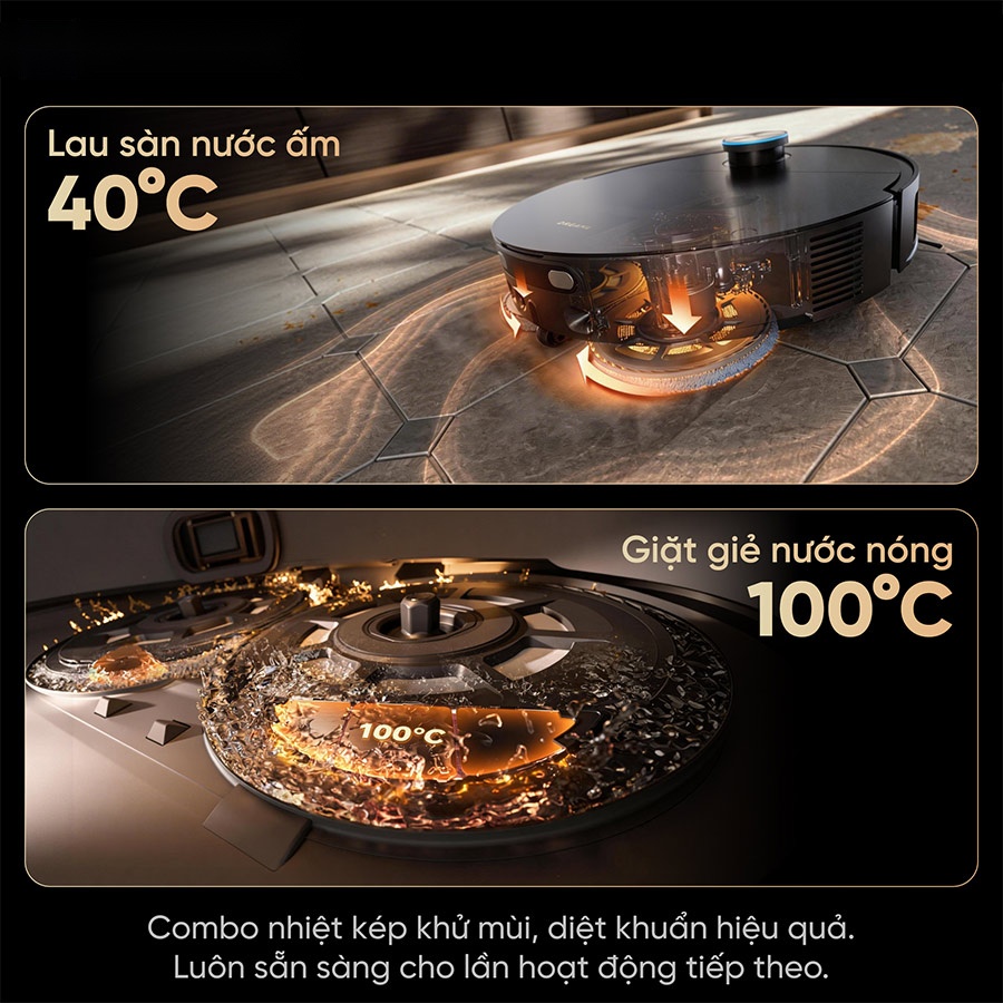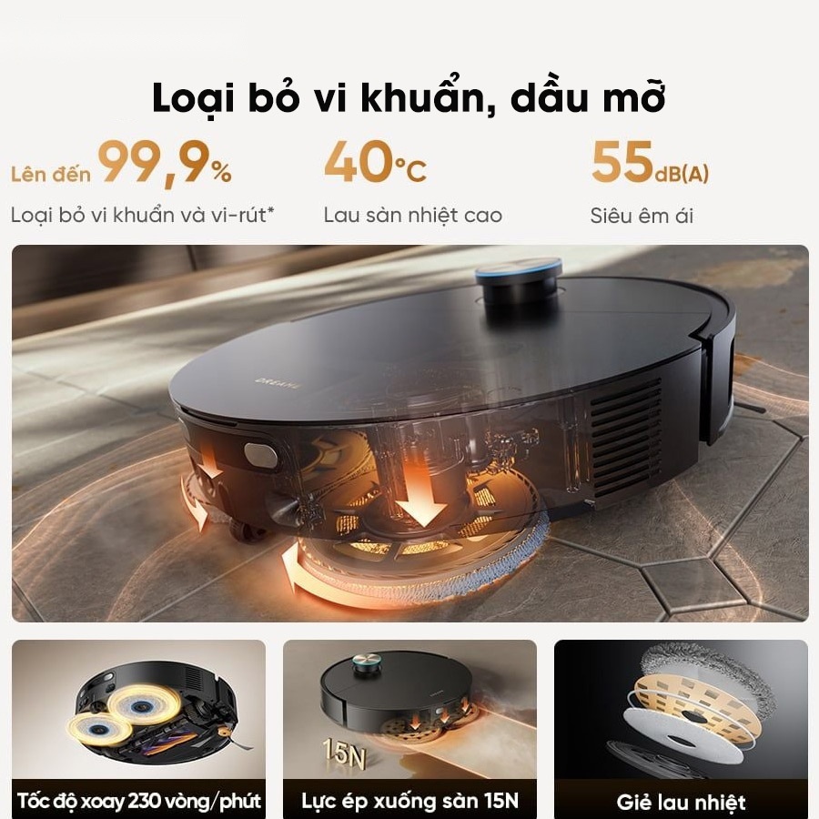 Nhiệt độ lau sàn duy trì ở mức khoảng 40°C giúp làm mềm các vết bẩn khó xử lý, đồng thời hỗ trợ loại bỏ vi khuẩn và vi-rút lên đến 99,9%. Bên cạnh đó, độ ồn khi vận hành chỉ khoảng 55dB giúp Dreame X60 Master hoạt động êm ái, không gây ảnh hưởng đến sinh hoạt hàng ngày.