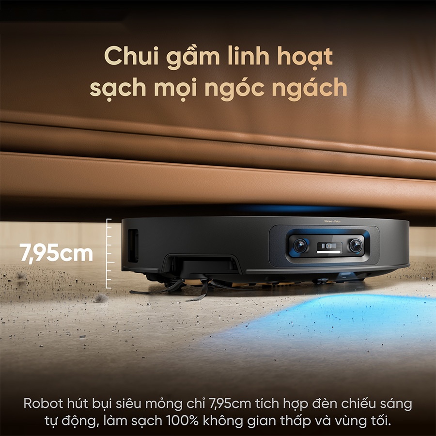 Với chiều cao chỉ 7,95cm, Dreame X60 Master dễ dàng tiếp cận những khu vực mà nhiều robot khác thường bỏ sót như gầm sofa, gầm giường hoặc tủ thấp. Khả năng luồn lách linh hoạt giúp thiết bị mở rộng phạm vi làm sạch lên đến gần như toàn bộ bề mặt sàn, giảm thiểu tình trạng tích tụ bụi bẩn lâu ngày. Đây là yếu tố quan trọng giúp duy trì môi trường sống sạch sẽ, đặc biệt tại những khu vực khó vệ sinh thủ công.