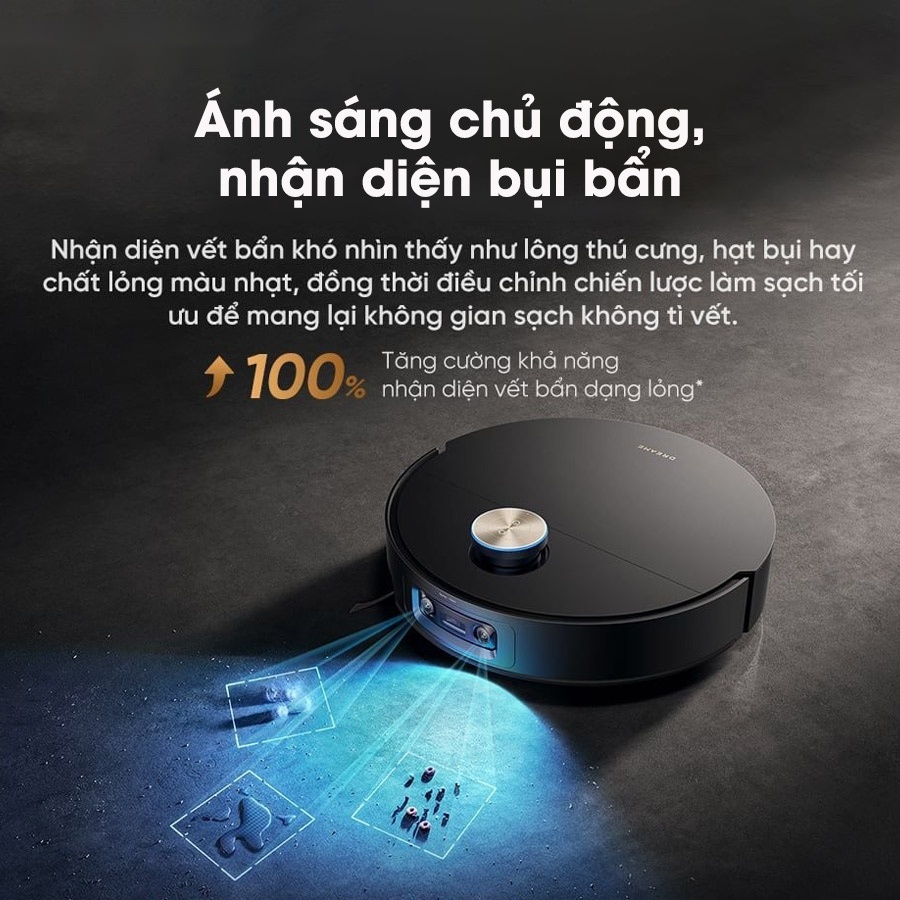 Hệ thống đèn chiếu sáng tích hợp giúp robot Dreame X60 Master phát hiện tốt hơn các loại vết bẩn khó nhìn thấy như chất lỏng trong suốt, bụi mịn hoặc lông thú cưng. Không chỉ dừng lại ở việc nhận diện, robot còn tự động điều chỉnh chiến lược làm sạch như tăng lực hút, giảm tốc độ chổi cạnh hoặc lau lại nhiều lần tại khu vực bẩn. Nhờ đó, hiệu quả làm sạch được nâng cao đáng kể, mang lại bề mặt sàn sạch sâu và đồng đều hơn.