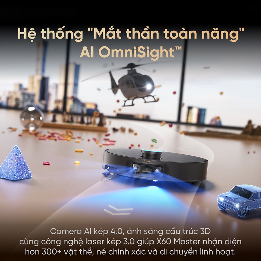 Robot hút bụi lau nhà Dreame X60 Master được trang bị hệ thống camera AI kép kết hợp công nghệ Stereo-Vision, cho phép nhận diện hơn 300 loại vật thể khác nhau, bao gồm cả những chi tiết nhỏ như dây điện, đồ vật mảnh hay vật cản thấp. Khả năng xử lý nhanh với thời gian phản hồi chỉ khoảng 0,1 giây giúp robot di chuyển mượt mà, hạn chế va chạm và tránh kẹt hiệu quả. Nhờ đó, thiết bị có thể hoạt động ổn định trong nhiều điều kiện ánh sáng, từ ban ngày đến môi trường thiếu sáng, đảm bảo quá trình làm sạch luôn chính xác và liên tục.