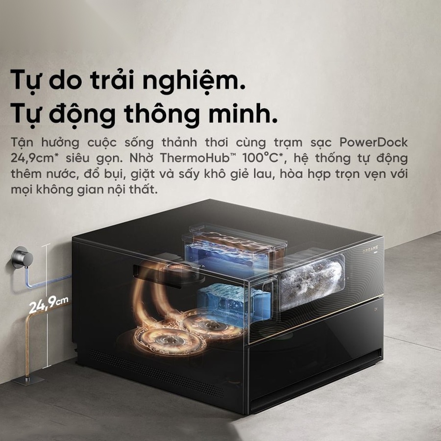 Hệ thống trạm sạc trên Dreame X60 Master không chỉ đơn thuần là nơi nạp năng lượng mà còn đóng vai trò trung tâm xử lý toàn bộ quy trình làm sạch. Với công nghệ ThermoHub, nước được gia nhiệt lên đến 100°C giúp làm sạch giẻ lau và khay giặt một cách triệt để, loại bỏ đến 99% vi khuẩn.