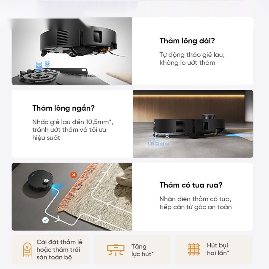 Robot hút bụi lau nhà Dreame X60 Master mang đến khả năng xử lý thảm linh hoạt nhờ hệ thống cảm biến và thuật toán thông minh. Khi phát hiện thảm lông dài, robot có thể tự động tháo giẻ lau để tránh làm ướt bề mặt. Với thảm lông ngắn, giẻ lau sẽ được nâng lên tối đa khoảng 10,5mm nhằm đảm bảo không gây ẩm nhưng vẫn duy trì hiệu quả hút bụi.