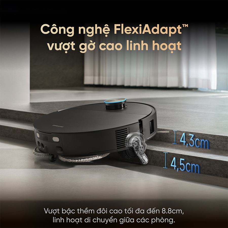 Dreame X60 Master được trang bị công nghệ vượt chướng ngại vật ProLeap, cho phép leo qua các bậc thềm hai lớp với tổng chiều cao lên đến 8,8cm. Điều này giúp robot di chuyển linh hoạt giữa các không gian khác nhau trong nhà mà không bị gián đoạn, kể cả khi có sự chênh lệch độ cao giữa các khu vực. So với nhiều dòng robot thông thường, khả năng này giúp hạn chế tối đa tình trạng mắc kẹt hoặc phải can thiệp thủ công.