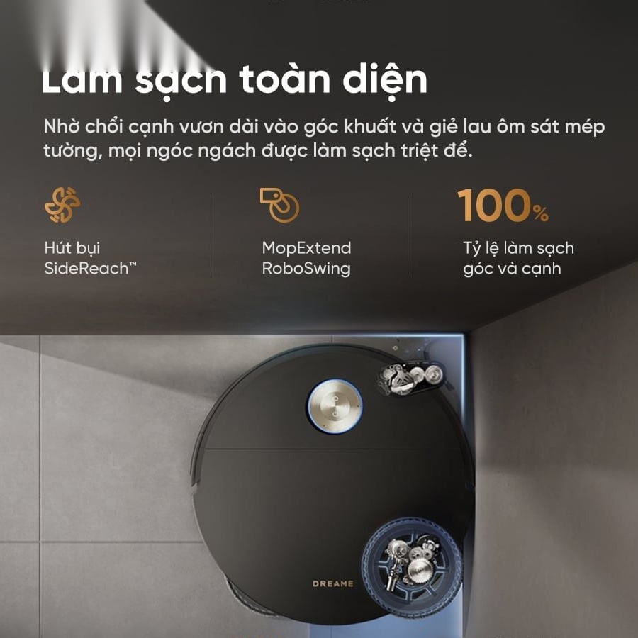 Robot hút bụi Dreame X60 Master được trang bị chổi cạnh có khả năng vươn dài cùng hệ thống giẻ lau linh hoạt, giúp tiếp cận sâu vào các góc tường, chân bàn ghế và những khu vực hẹp. Nhờ khả năng mở rộng lên đến 40mm, robot có thể làm sạch sát mép tường và hạn chế tối đa điểm mù trong quá trình vận hành. Đây là yếu tố giúp nâng cao hiệu quả làm sạch tổng thể, đặc biệt trong không gian có nhiều nội thất.