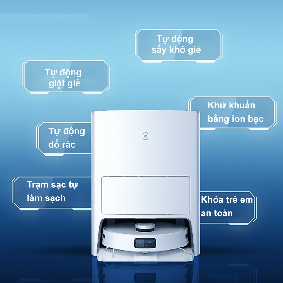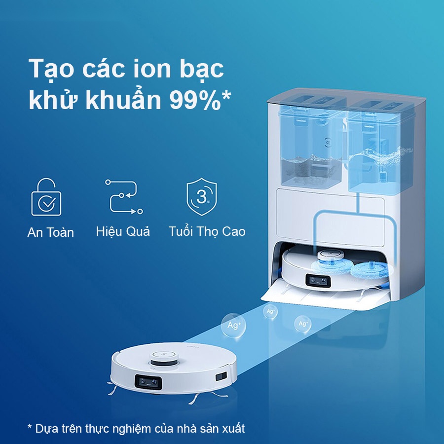 Robot hút bụi lau nhà Ecovacs T10 Omni được trang bị module khử trùng ion bạc Ag+, cho khả năng diệt khuẩn cực kỳ hiệu quả lên đến 99.9%. Quá trình khử khuẩn diễn ra theo chu trình khép kín từ bồn chứa nước, giẻ lau, sàn nhà và cả bồn chứa nước bẩn. Bên cạnh đó, công nghệ AI cũng giúp kiểm soát thông minh để đảm bảo nồng độ phù hợp và an toàn cho người dùng.