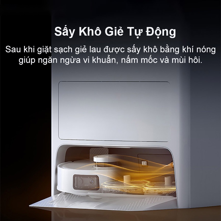 Sau quá trình làm sạch chổi lau thì Dock sạc T10 Omni sẽ tiến hành tự động sấy khô giẻ, làm sạch trạm và đáy trạm bằng khí nóng 40°C tuần hoàn 3 chiều. Điều này giúp giẻ lau được sấy khô toàn diện, tránh xuất hiện mùi hôi và ngăn chặn sự phát triển của nấm mốc và vi khuẩn.