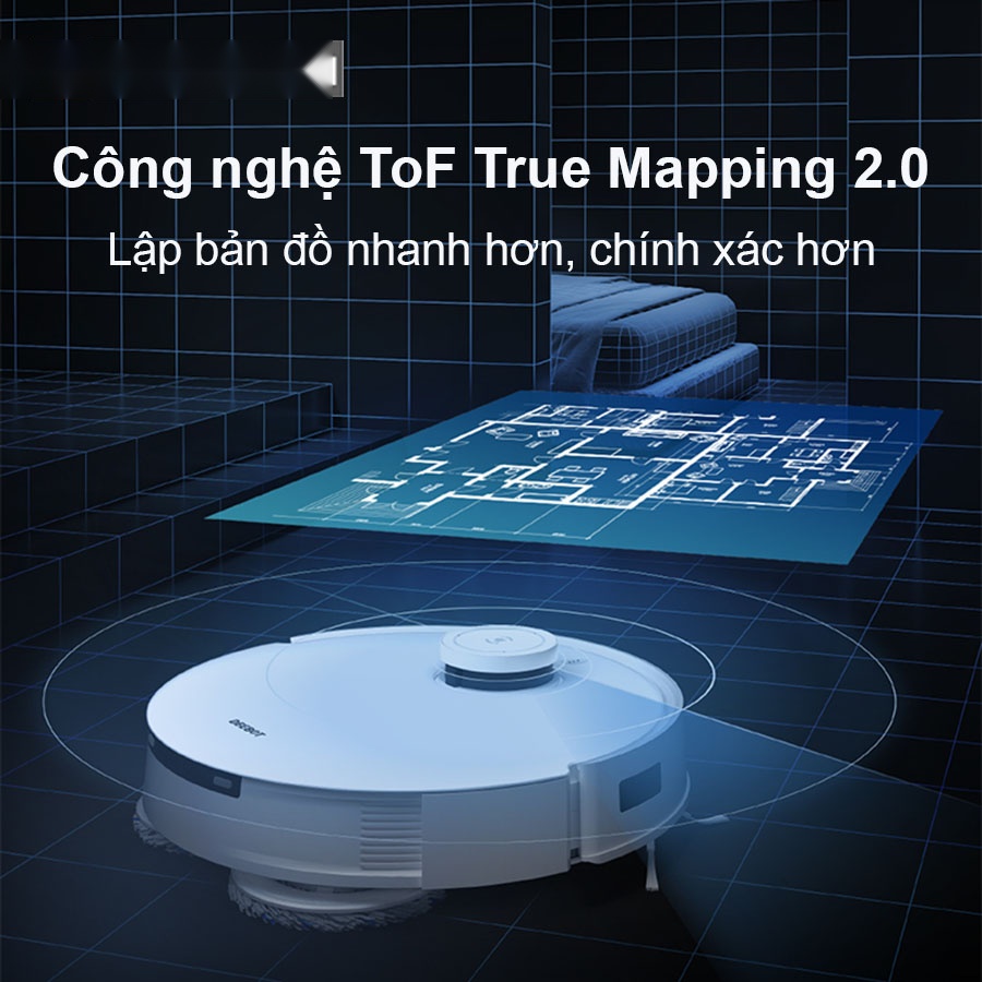 Robot hút bụi lau nhà Ecovacs Deebot T10 Omni trang bị công nghệ ToF True Mapping 2.0 hàng đầu cho robot có khả năng đánh giá, nhận biết vật thể trong nhà để tạo lập và xây dựng bản đồ 3D thời gian thực một cách hoàn chỉnh chỉ trong 6 phút với không gian chuẩn xác đến từng chi tiết. Ecovacs Deebot T10 Omni cung cấp độ chính xác của bản đồ được nâng cao, phạm vi quét được nâng cấp gấp 2 lần so với sử dụng laser LDS truyền thống.