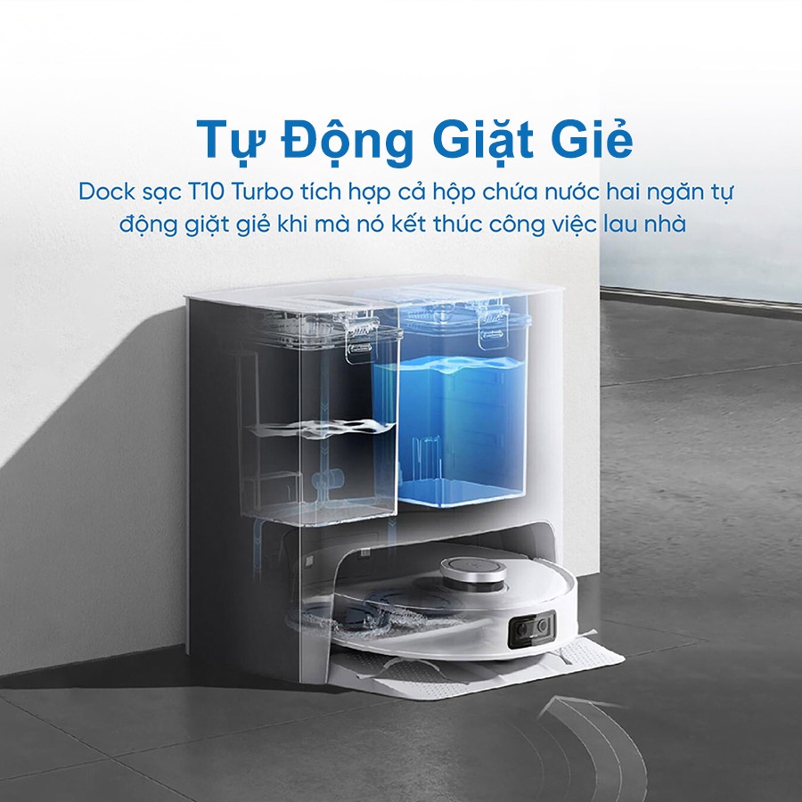 Robot hút bụi Ecovacs Deebot T10 Turbo nổi bật với trạm sạc đa năng, tích hợp tính năng tự động giặt và sấy khô giẻ lau. Sau khi hoàn thành công việc, robot sẽ quay lại trạm sạc và tự động giặt giẻ và sấy khô bằng khí nóng. Dock sạc của Deebot T10 Turbo có cả ngăn chứa nước sạch và nước bẩn, giúp người dùng không cần phải can thiệp trong quá trình hoạt động của robot.