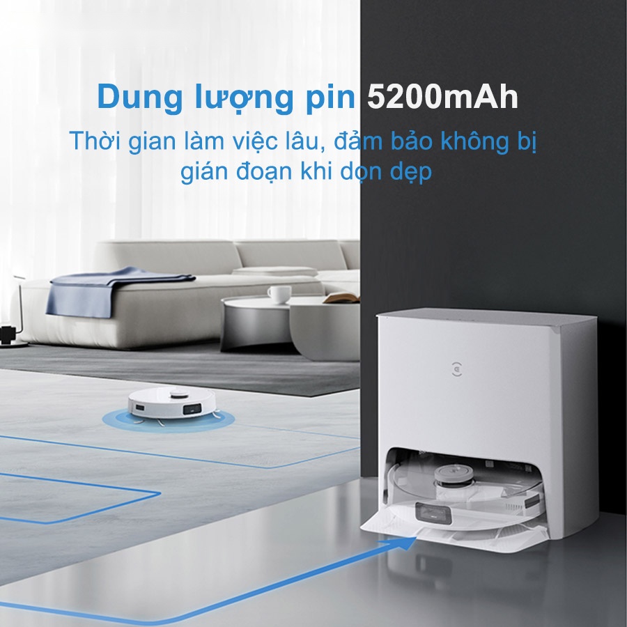 Với pin dung lượng 5200mAh, Ecovacs Deebot T10 đảm bảo khả năng hút bụi liên tục trong 195 phút hoặc thực hiện công việc hút bụi và lau nhà đồng thời trong tối đa 180 phút chỉ sau một lần sạc duy nhất. Khi pin yếu, Deebot T10 Turbo sẽ tự động quay trở lại đế sạc và sau khi sạc đầy sẽ tự động quay lại nơi mà nó đã dừng lại để tiếp tục công việc làm sạch.