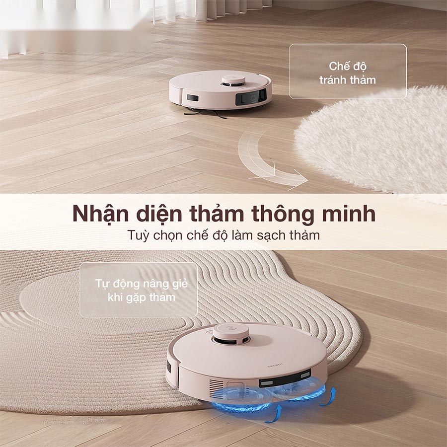 Tính năng này không chỉ bảo vệ thảm khỏi ẩm ướt mà còn ngăn ngừa lây nhiễm chéo, giữ cho thảm luôn sạch sẽ. Robot cũng có khả năng vượt chướng ngại vật cao đến 20mm, di chuyển linh hoạt trên nhiều loại bề mặt như thảm, sàn gỗ, và gạch men, đảm bảo hiệu quả làm sạch toàn diện trong mọi không gian sống.