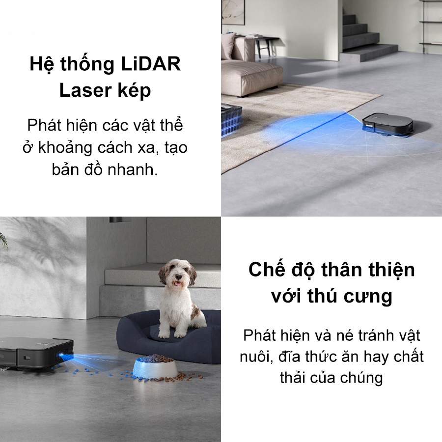 Bên cạnh đó, robot cũng được trang bị chế độ thân thiện với thú cưng, với sự hỗ trợ của cảm biến trí tuệ nhân tạo (AI). Nhờ tính năng này, robot có khả năng phát hiện và né tránh các chướng ngại vật, bao gồm cả vật nuôi, đĩa thức ăn hay chất thải của chúng. Ecovacs X2 Combo là sự lựa chọn lý tưởng cho những gia đình có thú cưng.