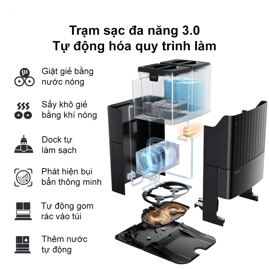 Với hệ thống tự làm sạch mới được tích hợp, phần đáy trạm sạc sẽ được làm sạch hiệu quả bằng các cần gạt xoay, bạn sẽ không cần phải vệ sinh trạm sạc thường xuyên như trước nữa. Thêm vào đó, khay tự làm sạch và đế giặt ở trạm sạc đều có thể tháo rời để dễ dàng vệ sinh khi cần.