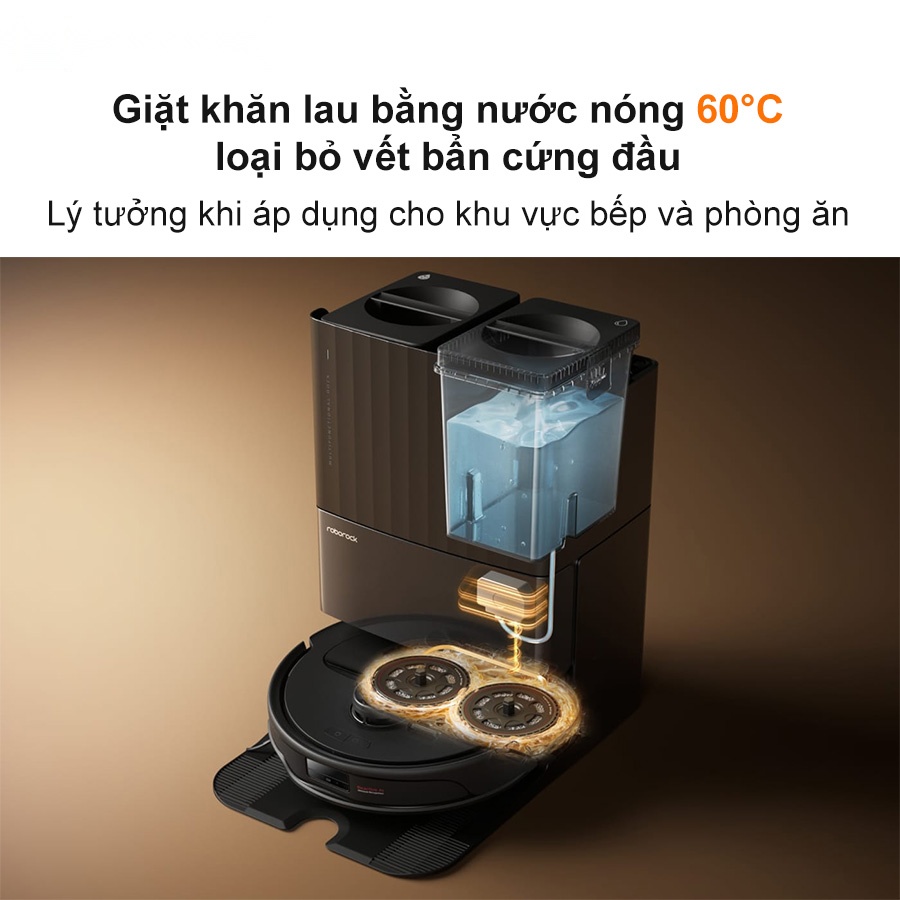 Trạm sạc của Roborock Q Revo Master với hệ thống giặt khăn lau bằng nước nóng ở nhiệt độ 60°C (140°F) giúp dễ dàng loại bỏ các vết bẩn cứng đầu, lý tưởng khi áp dụng cho khu vực bếp và phòng ăn, đồng thời tiết kiệm thời gian và nước. Nước nóng hiệu quả trong việc loại bỏ hơn 99.7% vi khuẩn trên miếng lau quay, đã được kiểm nghiệm bởi TUV.