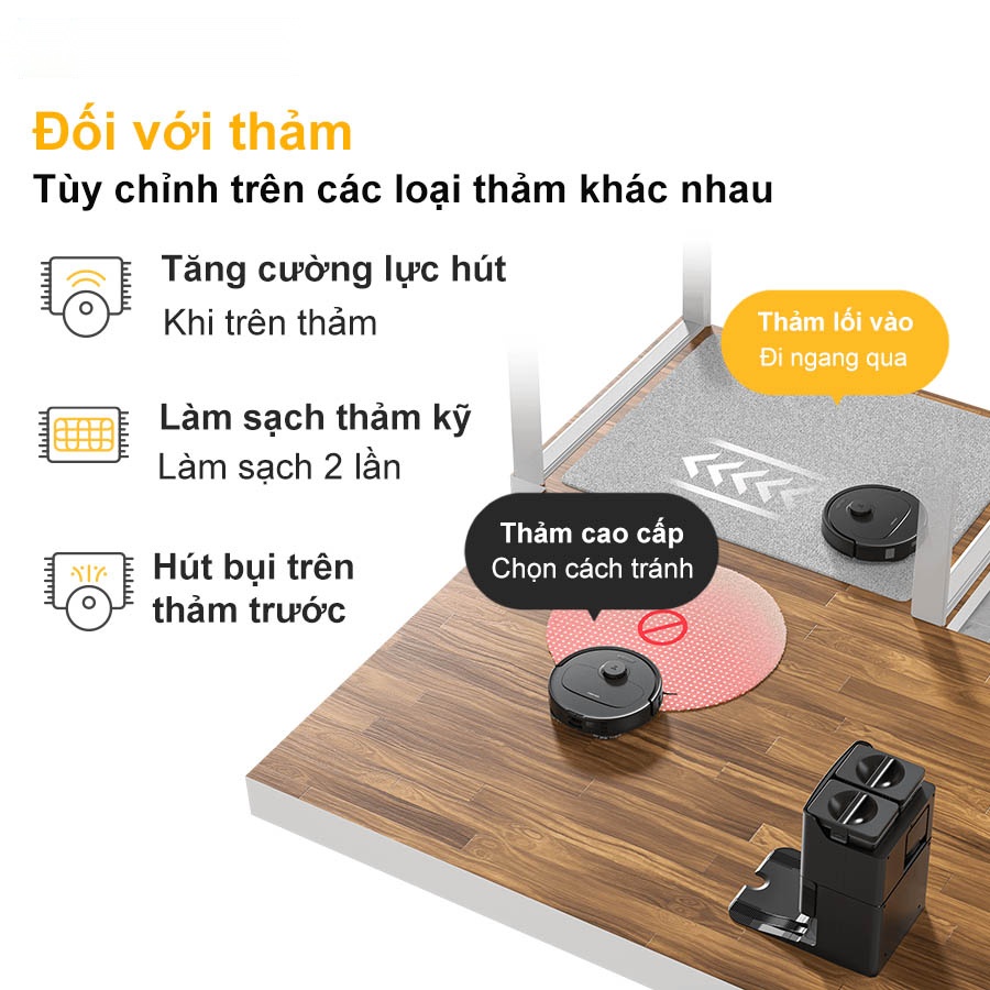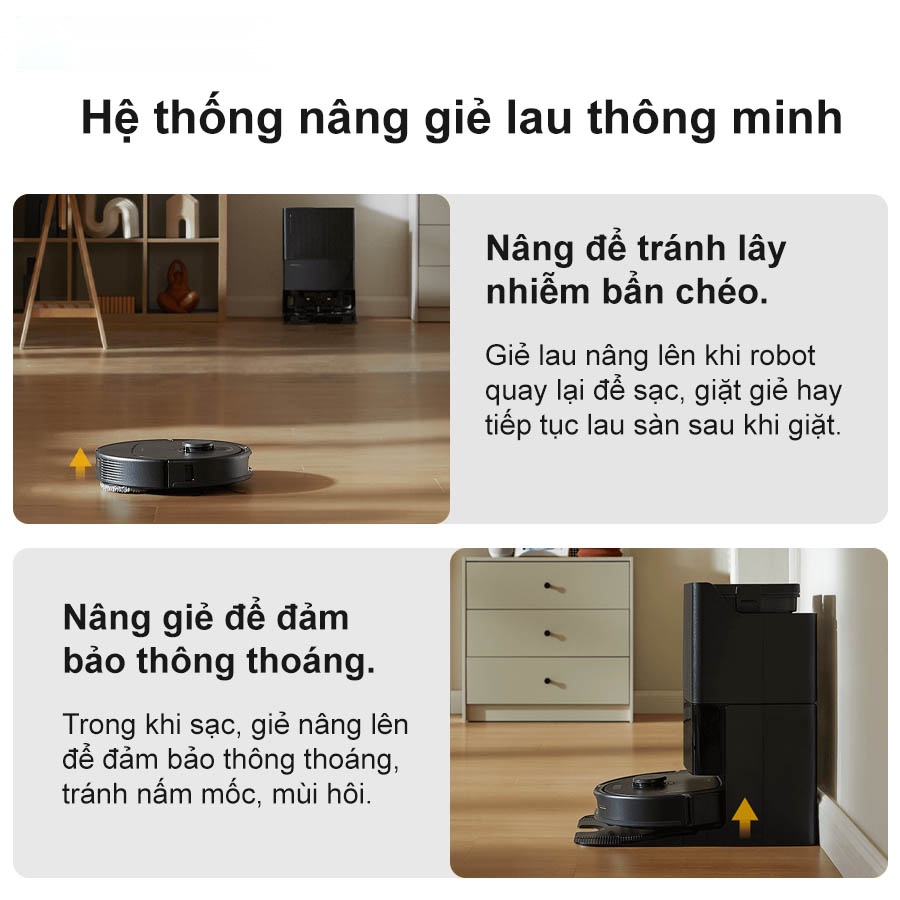 - Hệ thống nâng giẻ thông minh: nâng khi về dock hoặc quay về giặt giẻ, nâng khi sạc.