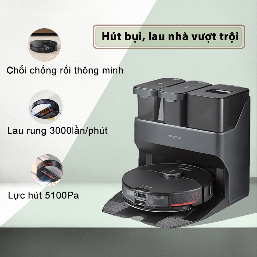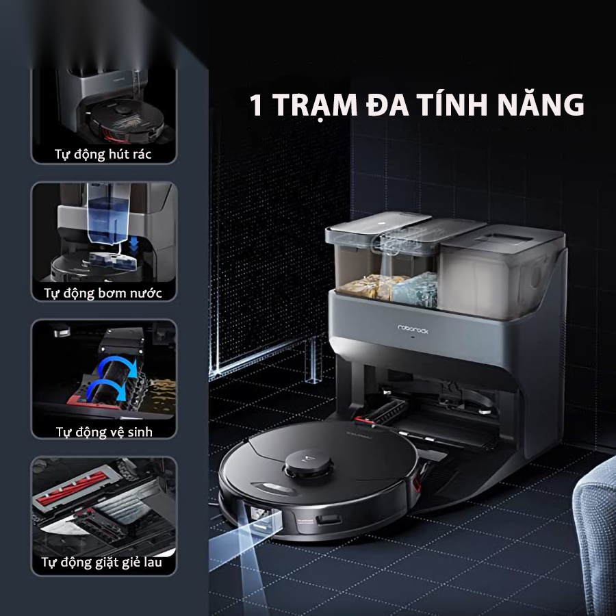 - Dock sạc hoàn toàn mới 3 in 1 : hệ thống làm sạch gồm 1 bình chứa rác 2.5L, 1 bình chứa nước sạch 3L và 1 bình chứa nước bẩn 2.3L.