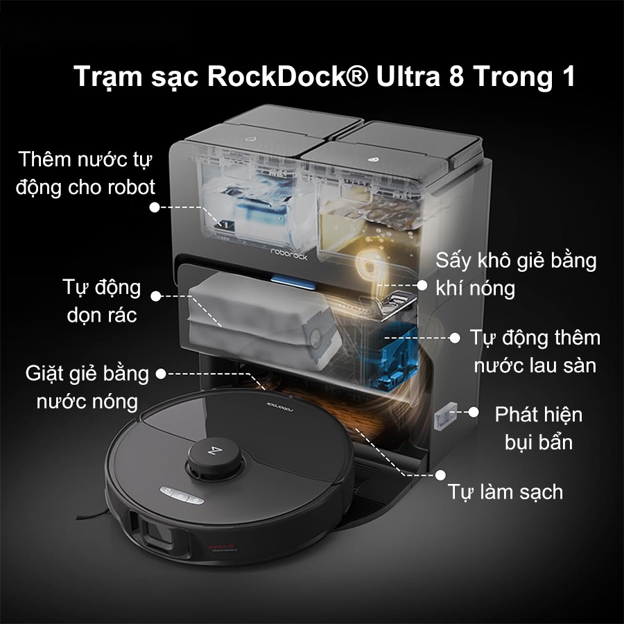 Robot hút bụi lau nhà Roborock S8 Max Ultra được trang bị trạm sạc đa chức năng 8 trong 1 vô cùng hiện đại và tiện lợi. Với RockDock® Ultra, bạn sẽ trải nghiệm một cấp độ tiện nghi hoàn toàn mới với hàng loạt tính năng hiện đại.
