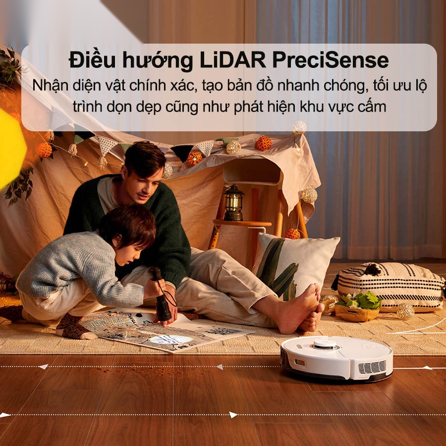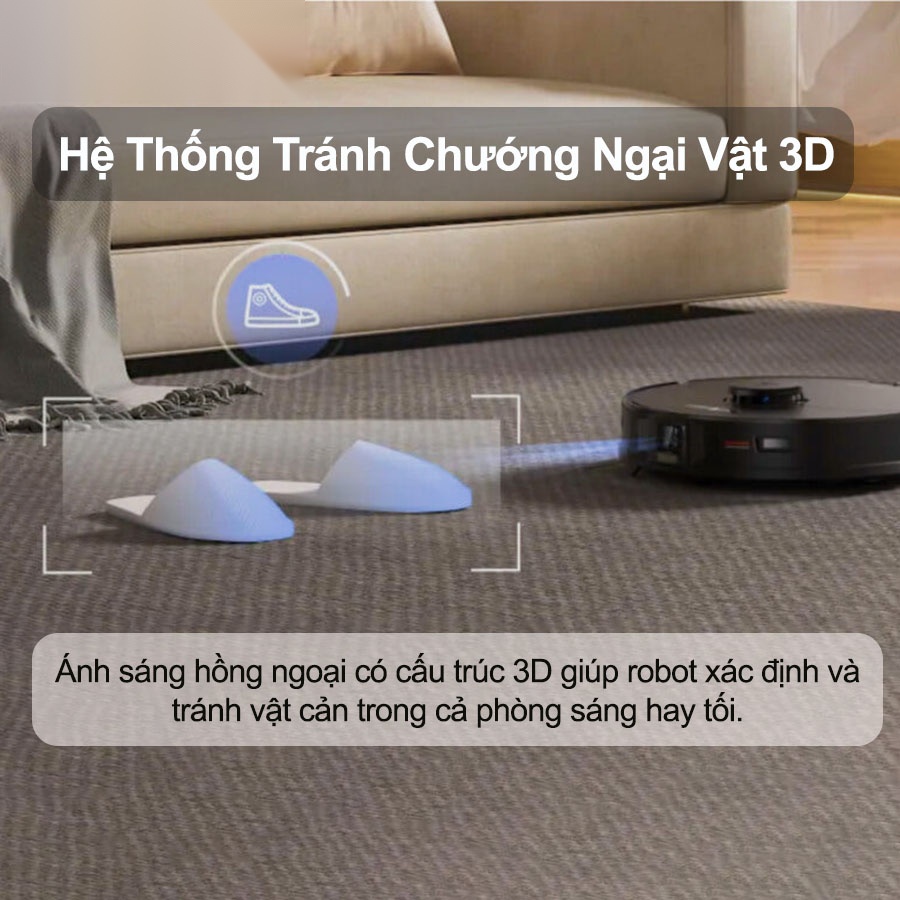 - Hệ thống tránh chướng ngại vật 3D kết hợp với hệ thống điều hướng LiDAR thông minh lau sạch mọi khu vực trong nhà.