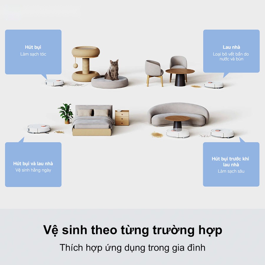 - Hút bụi và lau nhà 2 trong 1, mô phỏng quy trình vệ sinh thủ công