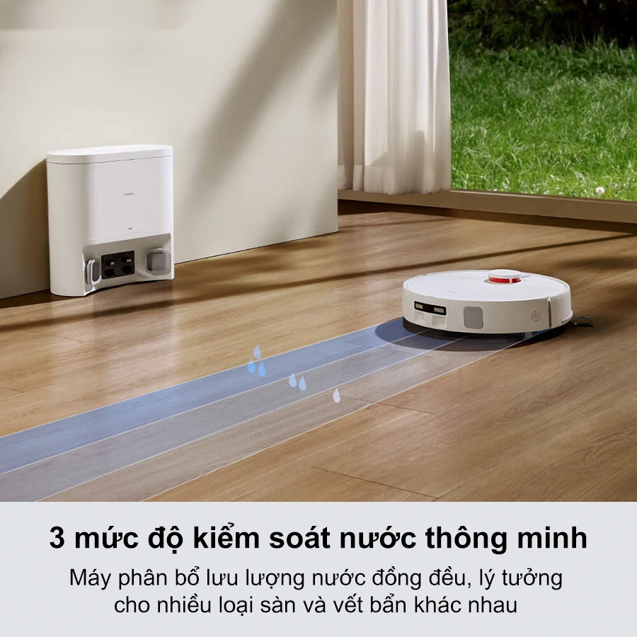 Robot hút bụi lau nhà Xiaomi Vacuum H40 được trang bị bình nước dung tích 210ml cùng 3 mức kiểm soát lưu lượng nước thông minh, có thể tùy chỉnh trực tiếp trong ứng dụng Xiaomi Home. Nước được phân bổ đều lên bề mặt sàn, phù hợp với nhiều loại vật liệu và vết bẩn khác nhau, giúp lau nhà hiệu quả mà không gây đọng nước.
