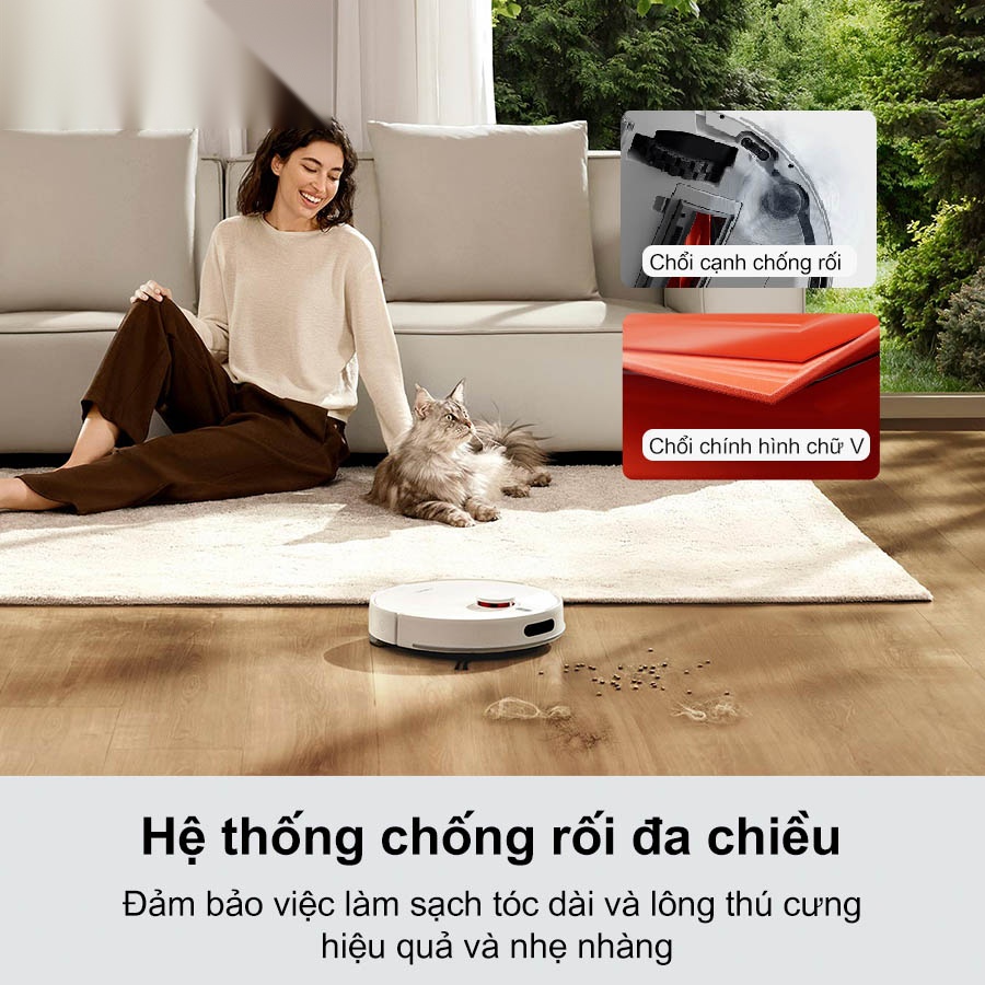 Robot hút bụi lau nhà Xiaomi Vacuum H40 được trang bị công nghệ chống rối đa chiều với quy trình làm sạch 5 bước gồm: quét – lăn – thu gom – chải – hút. Thiết kế chổi chính hình chữ V màu vàng kết hợp cùng chổi cạnh chống rối giúp tóc và lông được dẫn hướng mượt mà vào khoang hút, hạn chế tối đa tình trạng quấn rối ở chổi, kể cả với tóc dài hoặc lông thú cưng.