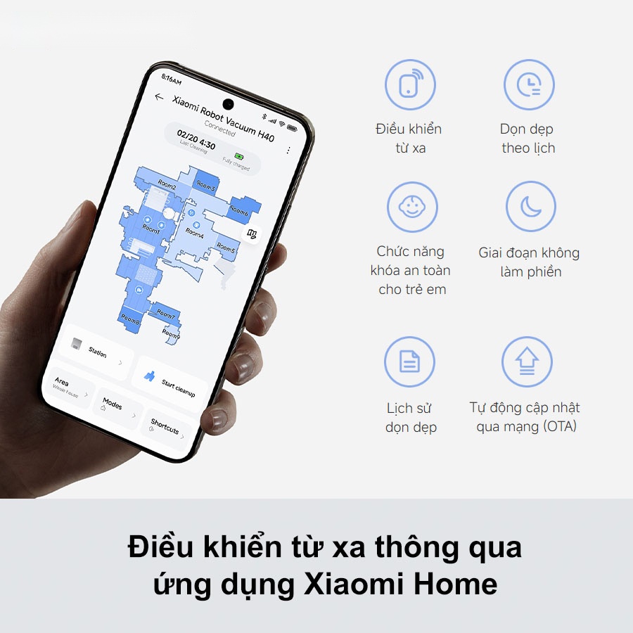 - Điều khiển, lên lịch và theo dõi vệ sinh qua ứng dụng Xiaomi Home
