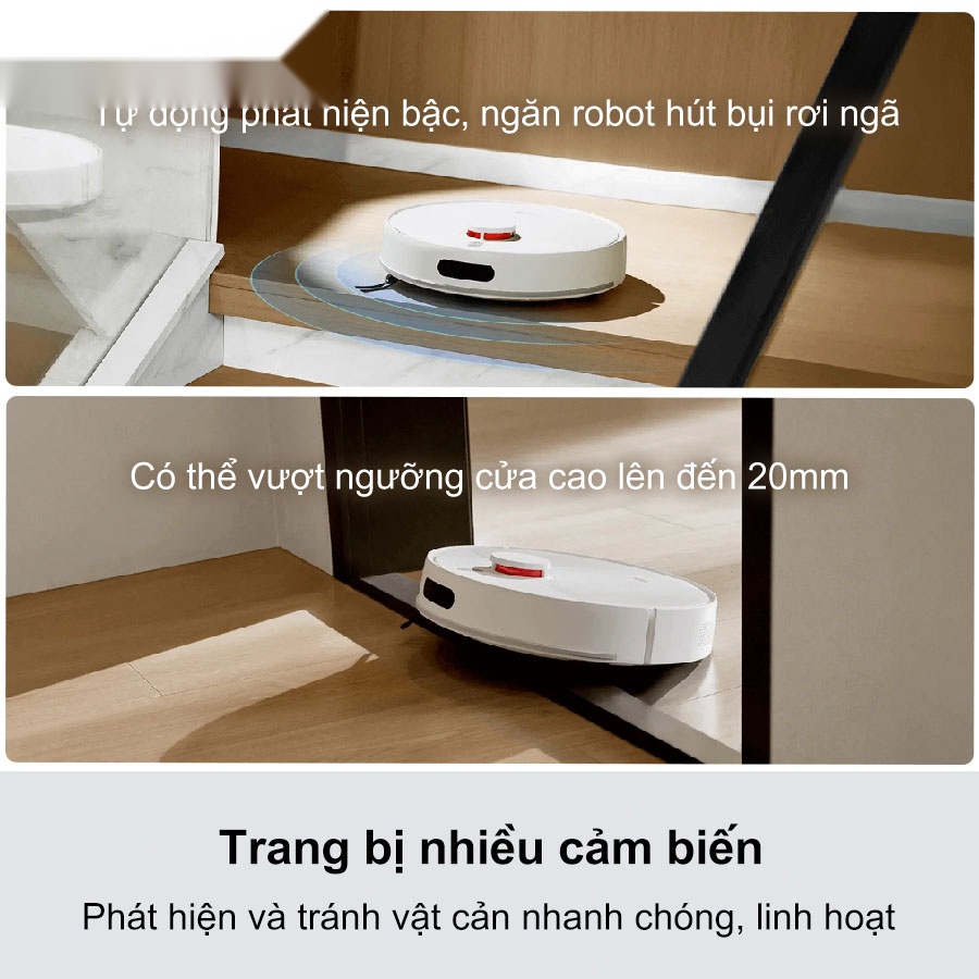 Thiết bị được trang bị nhiều cảm biến thông minh giúp nhận diện chướng ngại vật chính xác, tự động tránh va chạm và hạn chế kẹt máy. Robot có khả năng phát hiện bậc thang để ngăn rơi ngã, tự quay về đế sạc khi pin yếu và vượt ngưỡng cửa cao lên đến 20mm, đảm bảo vận hành ổn định trong môi trường phức tạp.
