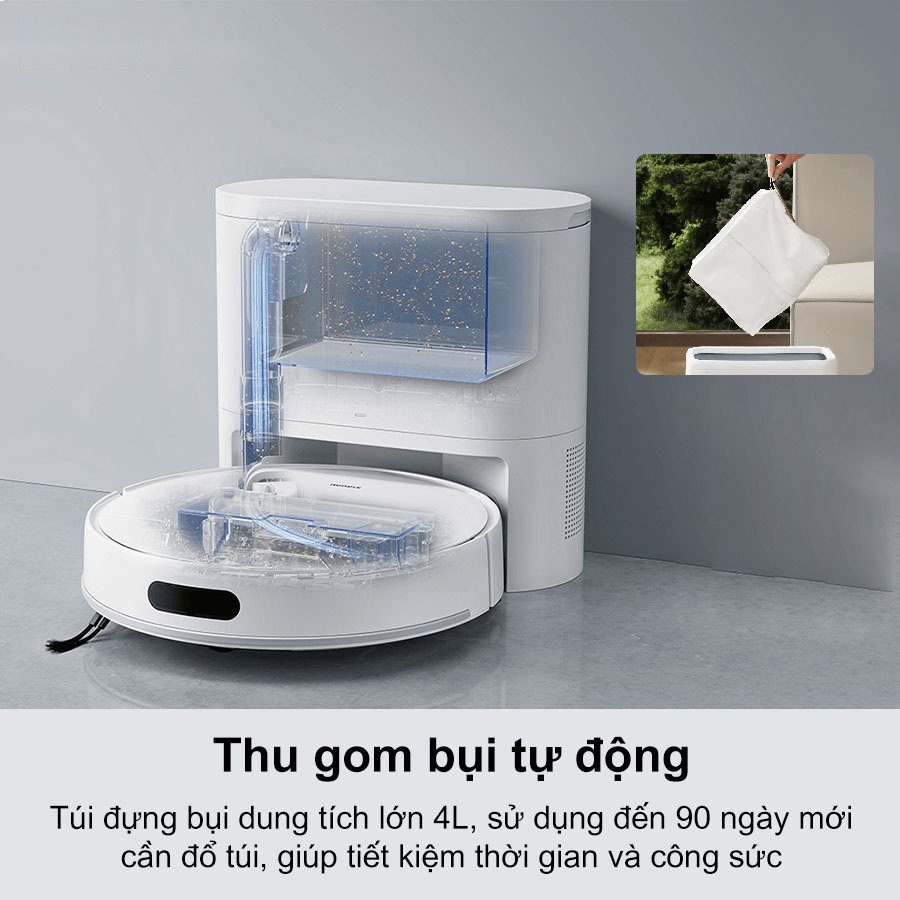 - Tự động gom bụi với dung tích lớn 4L, sử dụng đến 90 ngày không cần đổ rác