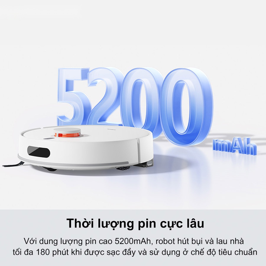Nhờ viên pin dung lượng cao 5200mAh, robot Xiaomi Vacuum H40 có thể hoạt động liên tục lên đến 180 phút ở chế độ tiêu chuẩn. Thời lượng pin dài cho phép Xiaomi Vacuum H40 vừa hút bụi vừa lau sàn trên diện tích lớn mà không bị gián đoạn, phù hợp với căn hộ và nhà nhiều phòng.