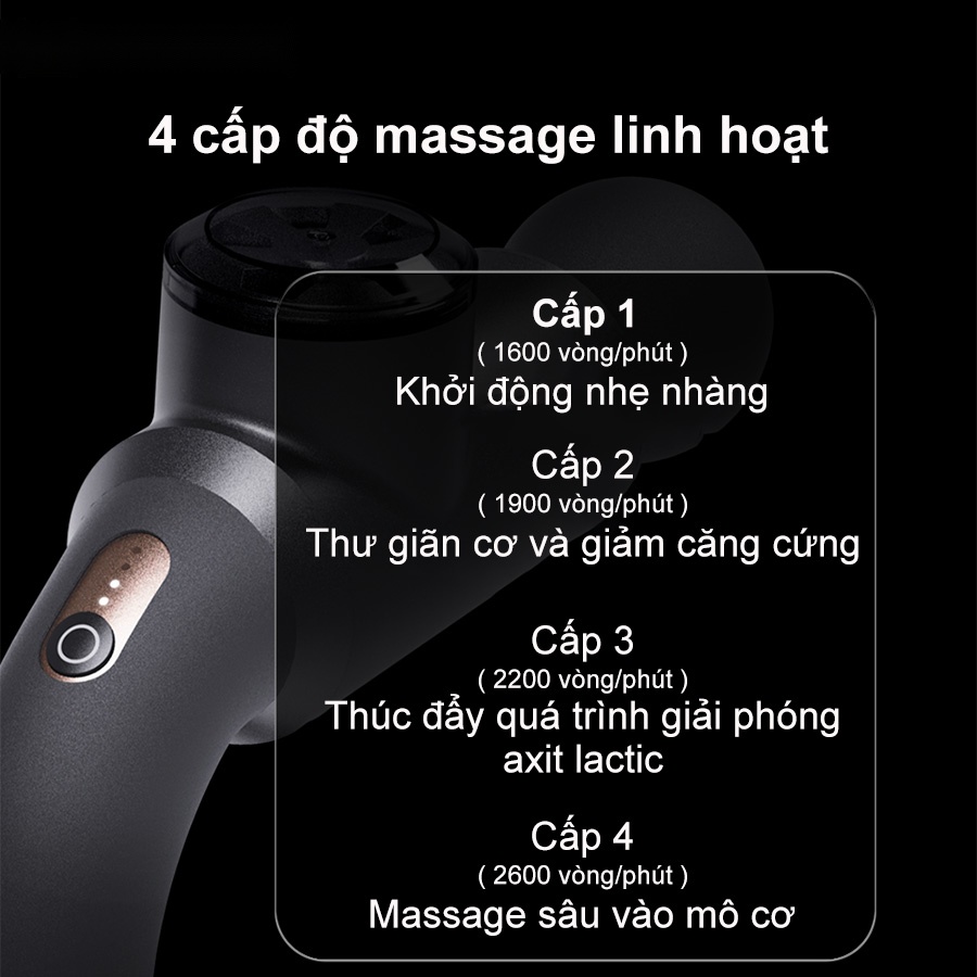 - Cấp độ 4 (2600 vòng/phút): Tác động sâu vào mô cơ, phù hợp cho các vận động viên hoặc người thường xuyên tập luyện cường độ cao, giúp xử lý các điểm đau cứng đầu một cách chuyên sâu.